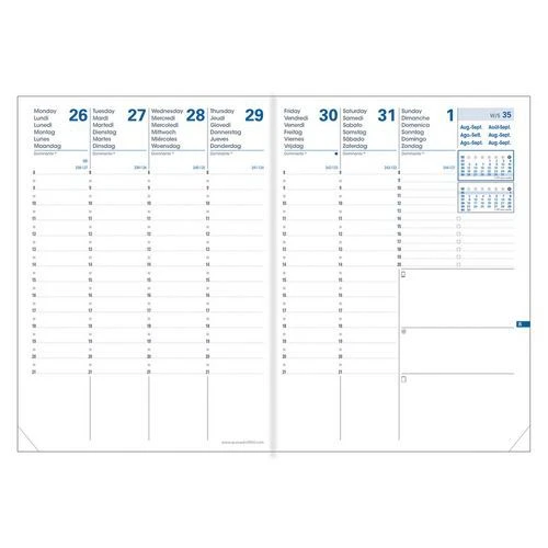 - Agenda hebdomadaire avec présentation de la semaine sur 2 pages afin d’offrir une vue d’un seul coup d’œil.
