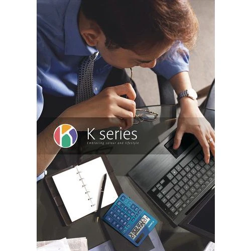 - Calculatrice au coloris vif bleu et aux finitions métallique.
