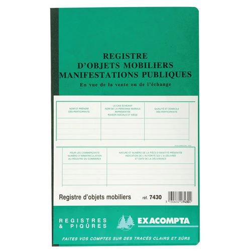 - Piqûre 32×19,5cm – Registre d’identification des vendeurs en vue d’une manifestation publique – 80 pages Tout organisateur d’une vente au déballage (brocantes, vide-greniers…) est tenu d’établir un registre des vendeurs.