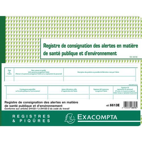 - Piqûre 24x32cm – Registre de consignation des alertes en matière de santé publique et d’environnement – 20 pages Permet la consignation des alertes déclenchées par les salariés ou le CHSCT en cas de risque sanitaire ou environnemental (date de l’alerte, nom du lanceur d’alerte, produits ou procédés visés, conséquences potentielles sur la santé et l’environnement, …).