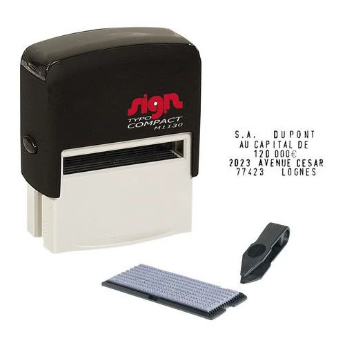 - Kit comprenant : 1 pince + 2 polices de caractères en 3 et 4 mm + 1 cassette encrée noire + 1 compact encrage automatique plaque rainurée.