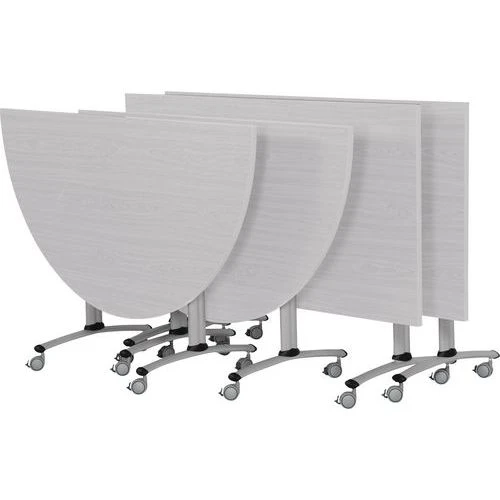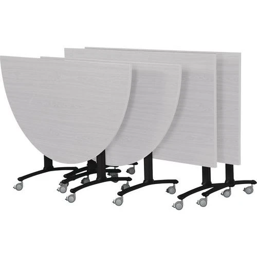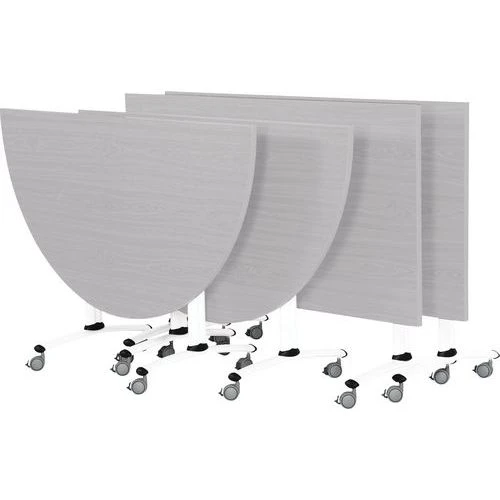 - Pack de réunion Axe composé de 2 tables rectangulaires 160×68 cm + 2 tables 1/2 rondes 136×68 cm avec plateau pivotant permettant un gain de place pour le rangement.