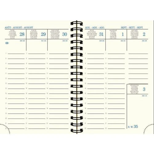 - Les plus : impression en bleu et gris sur papier ivoire Clairefontaine, reconnu pour sa qualité et pour permettre une écriture douce et fluide – coins détachables, pour pouvoir accéder rapidement au jour en cours – indication du numéro de semaine pour se repérer plus facilement.